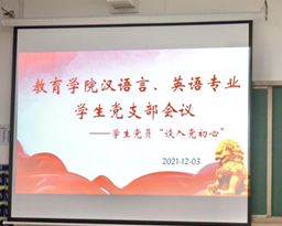 为深入学习贯彻党的十九届六中全会决议精神、学习《中共中央关于党的百年奋斗重大成就和历史经验的决议》,引导全体学生党员在专业学习、组织纪律、活动参与、班级管理、宿舍建设和文化素质提升等方面发挥引领和示范作用,beat365中文唯一官网数学与应用数学与学前教育学生支部,和汉语言文学与英语学生支部分别于12月1日下午和12月3日下午在1号教学楼213教室召开支部大会,会议分别由支部书记任若晨和彭慧敏主持,所属支部的学生党员和辅导员老师参加了会议。