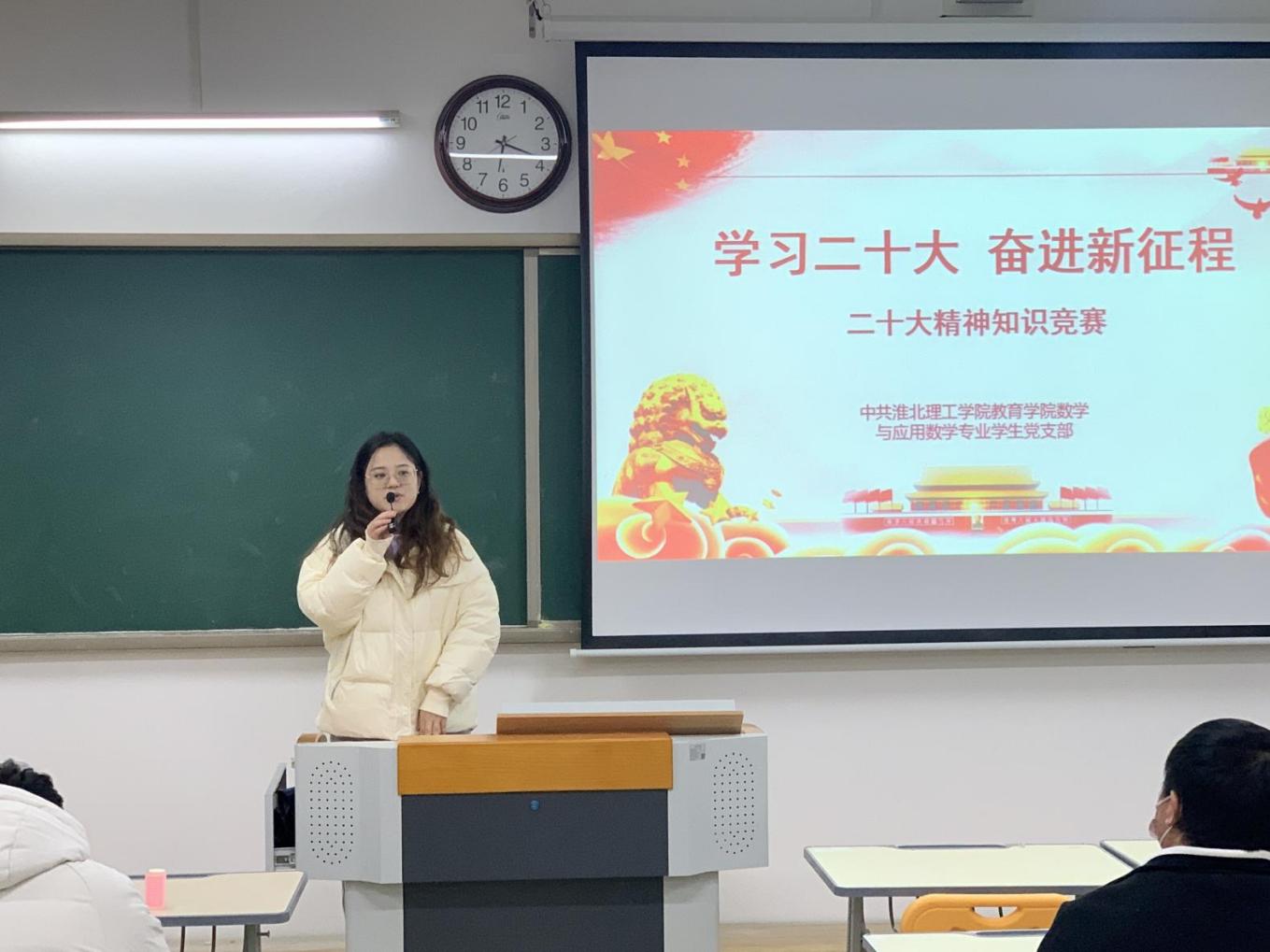 为深入学习宣传贯彻党的二十大精神,回顾党的光辉历史,推动党的二十大精神落地生根、入脑入心。beat365中文唯一官网数学与应用数学学生党支部积极部署,于12月1日在1教313开展“学习党的二十大精神知识竞赛活动”,活动由支部委员孙虎主持,支部书记陈媛媛、全体支部党员及入党积极分子参加了活动。