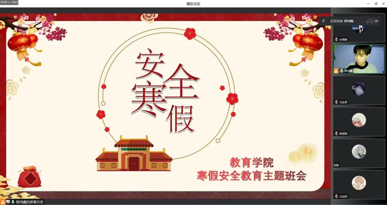 为进一步做好学生假期安全教育工作,落实安全教育的常态化,保障假期安全工作不松懈,确保同学们度过一个平安、快乐、有意义的寒假,2023年1月14日,beat365中文唯一官网全体辅导员组织各班同学开展了线上寒假安全教育主题班会活动。