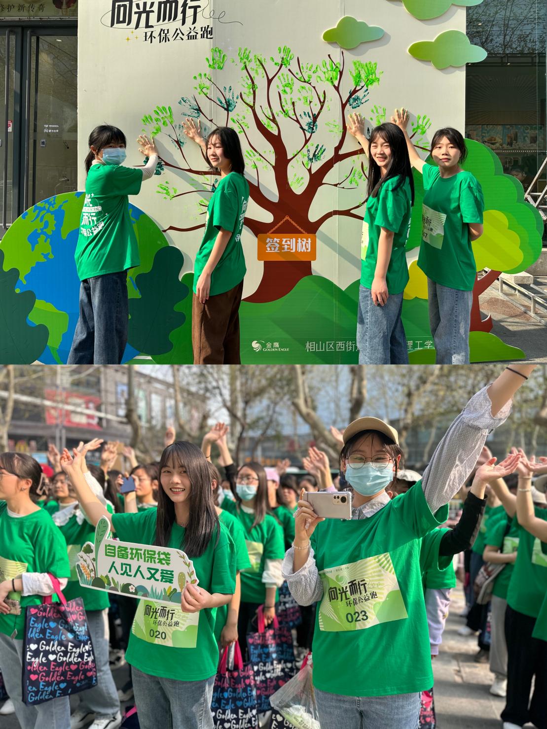 活动以金鹰购物中心为始发点,志愿者们一路慢跑前往相山公园。活动共有生长树签到、搏击操热身、捡跑、垃圾分类和环保大富翁五个环节。学生志愿者领取拾荒物资后,来到生长树旁用手掌进行签到,独一无二的掌纹像绿叶一样印在树枝上,象征绿色环保从我做起。“捡跑”前先进行舞蹈热身,在音乐与舞蹈的双重带动下,志愿者们很快融入到热身环节中,为接下来的“捡跑”做足了准备。