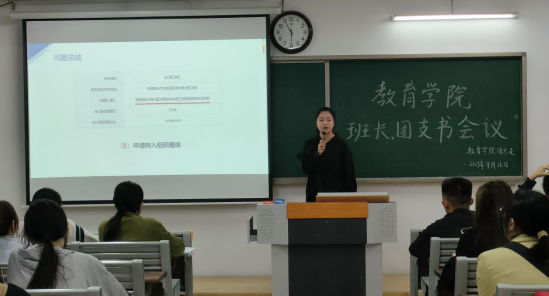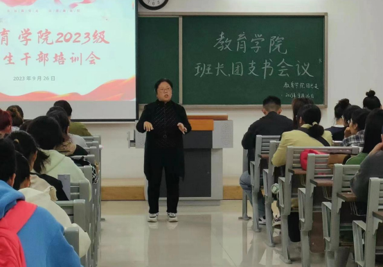 为进一步强化学生干部队伍建设,发挥学生干部模范带头作用,促进学院学生管理工作的有序开展,9月26日下午,beat365中文唯一官网在1号教学楼520教室召开2023级学生班级班长、团支书培训会。学院分管副书记孟向红、书记助理黄莹莹、团总支副书记许海涛、2023级全体辅导员以及2023级全体班长、团支书参加了本次培训会。