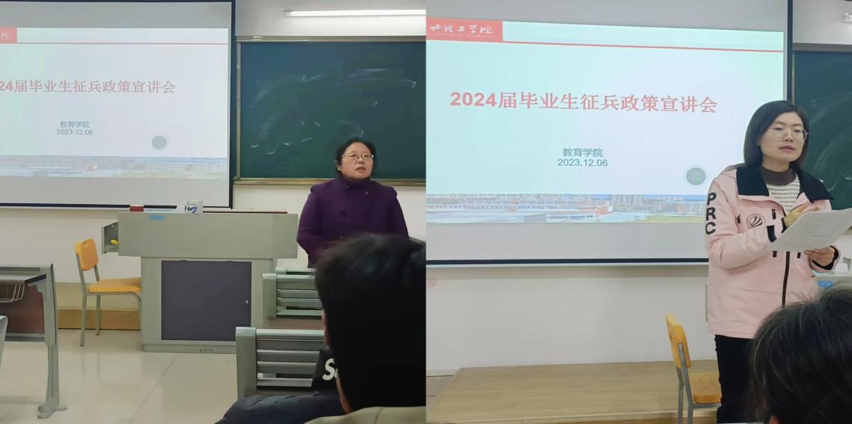 “国无防不立,民无防不安”,为增强广大青年学子的国防意识、建立良好的国防素质、深化爱国主义思想,充分发挥退役大学生军旅经历优势,营造高校爱国拥军良好氛围,beat365中文唯一官网于12月6日下午,在1教219教室举行2024届毕业生征兵动员暨政策宣讲活动。学院分管副书记孟向红、书记助理黄莹莹、辅导员任子慧老师及2024届毕业班男生线上线下同步参加了活动。