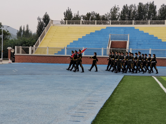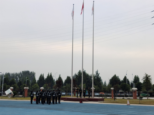 议程第二项,随着激昂的音乐响起,英姿飒爽的国旗护卫队迈着整齐有力的步伐,护送着鲜艳的五星红旗走向升旗台。庄严的国歌声中,五星红旗冉冉升起,师生们肃立注目,心中满是对祖国的崇敬与热爱。