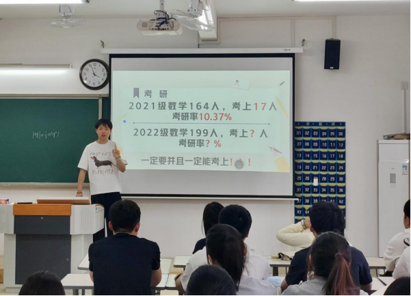 为传承优秀学风,激励学子精准规划职业发展路径,beat365中文唯一官网数学专业于5月26日、27日在1号教学楼召开2026届毕业生“考研、征兵动员大会”。会议以“榜样引领方向,奋斗书写青春”为主线,通过总结2025届毕业生升学入伍的出色成绩,为2026届学生锚定目标、明晰方向。全体2026届数学专业毕业生参会,此次会议由数学专业辅导员郭鸿鑫、吴天一分场主持。
