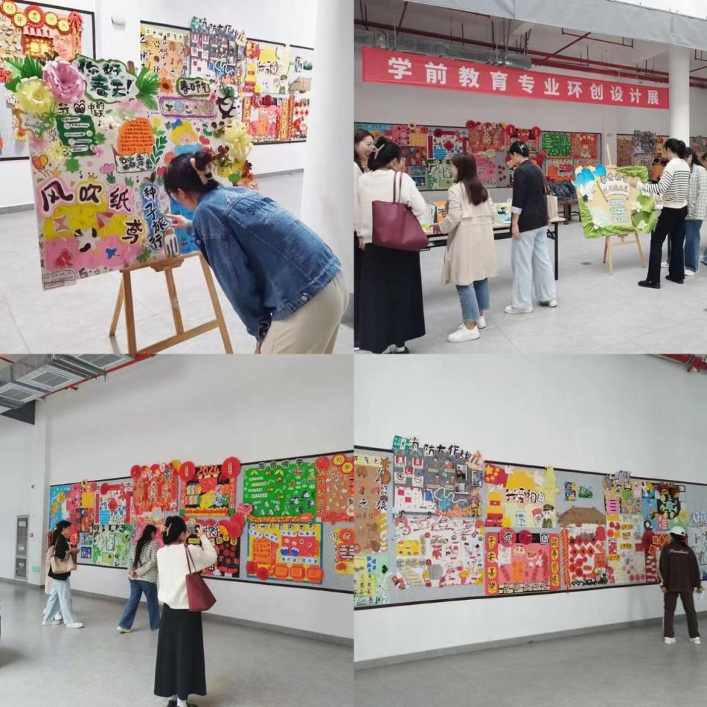 本次活动一共分为三个展区,吸引了学前教育专业数百件极具创意和实用性的作品参展。作品涵盖了幼儿园区域环境创设、墙饰设计及”玩教具“设计多个领域,展现了同学们在创新理念、手工技能和审美观念方面的独特见解。展品中有的独具匠心,将学前专业书法课程与手工技能巧妙融合,创设了多件符合中国传统元素的优秀区域设计作品;有的将中国民间工艺融入墙饰环创,展现了传统工艺的同时也提升了民间艺术的传播。