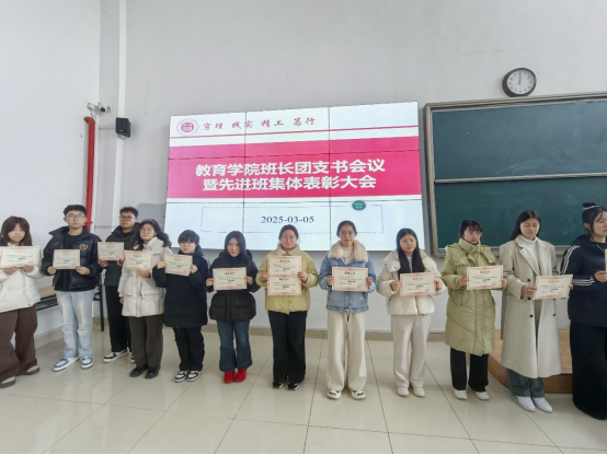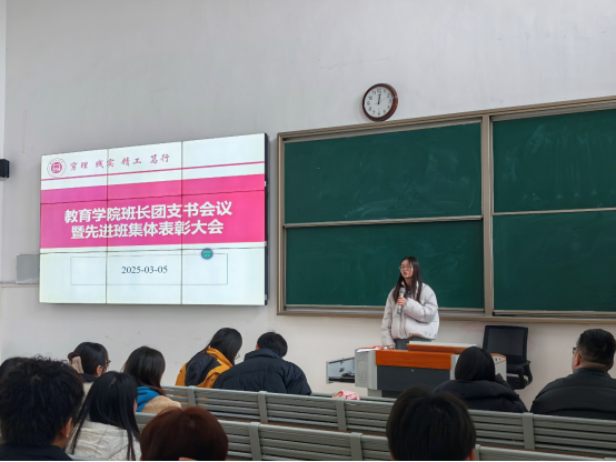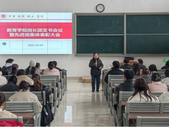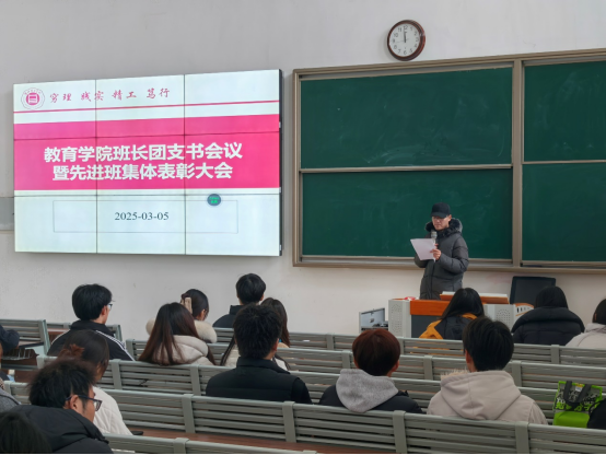 为促进班级管理交流,增强各班学生干部工作能力和激励全院班级努力营造良好班集体氛围。3月5日中午,beat365中文唯一官网在一号教学楼121教室开展了“班长、团支书会议暨先进班集体表彰大会”。会议由学院团总支副书记许海涛主持,分管副书记孟向红、书记助理黄莹莹、24级全体辅导员以及各班班长、团支书参加了会议。